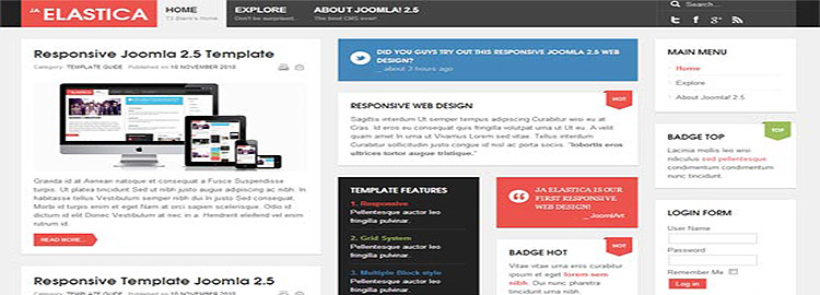 JA Elastica - совершенно бесплатный отзывчивым шаблон joomla 3.5 - 2.5 распространяемый под лицензией GNU / GPL V3. Шаблон отлично работает на мобильных телефонах, планшетах, нетбуках и других портативных устройствах.